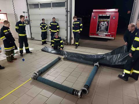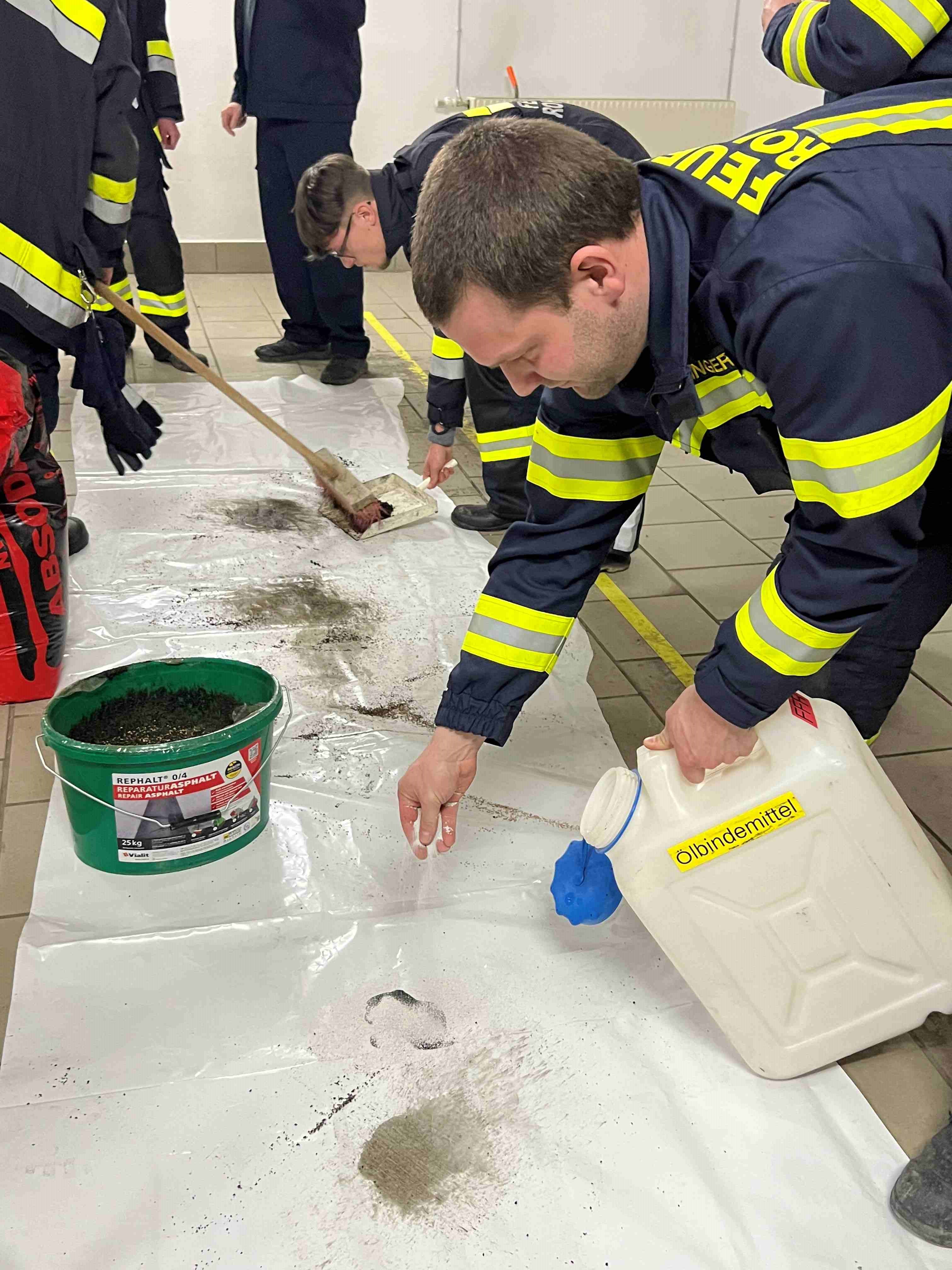 Am Freitag, 13.2.2026 stand das Thema „Schadstoff: Austritt von Flüssigkeiten“ am Ausbildungsplan der Feuerwehr Rohrendorf: LM Franz Fehr und HBM Stefan Jell unterwiesen die zahlreich teilnehmenden Kameraden im richtigen Umgang mit austretenden Schadstoffen und die damit notwendigen Schutzmaßnahmen. Nach einer kurzen Theorieeinheit im Lehrsaal, bei der Kennzeichnung und die richtigen Verhaltensregeln beim Umgang mit giftigen Substanzen aufgefrischt wurden, fand der informative Schulungsabend in den Fahrzeughallen seine Fortsetzung. Die Übungsverantwortlichen Franz Fehr und Stefan Jell zeigten den Teilnehmenden die speziell für Schadstoffe entwickelten Ausrüstungsgegenstände in allen Fahrzeugen der Feuerwehr Rohrendorf und erprobten praktisch deren Handhabung. So wurde ausgetretenes Öl fachgerecht gebunden, Schutzanzüge anprobiert und Wannen zum Auffangen von Flüssigkeiten hergestellt.